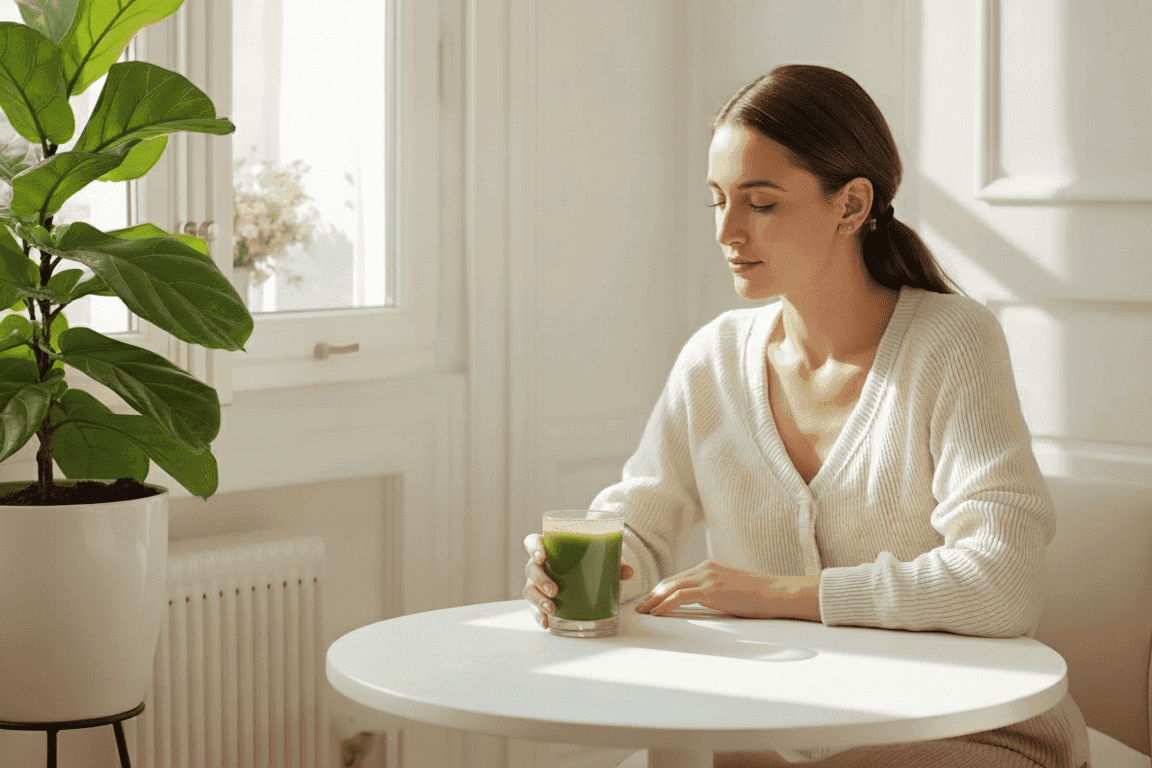 Un moment pour soi, un geste simple : une cuillère de poudre verte dans un verre d’eau, un jus ou un smoothie.