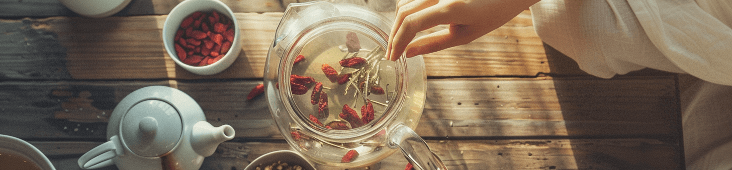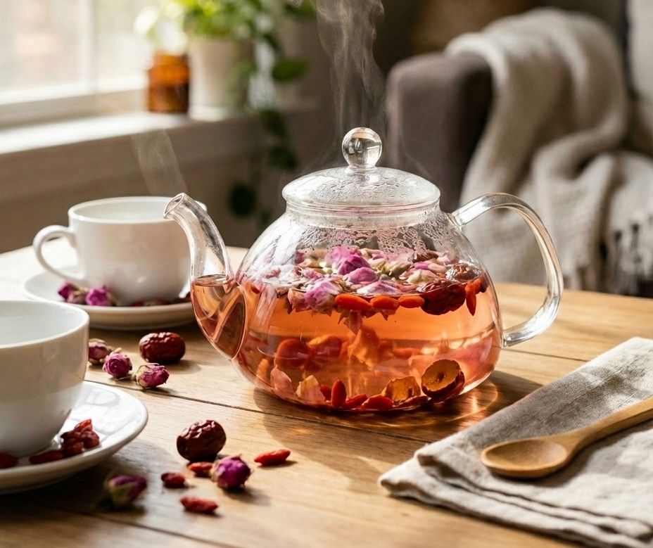 Rose buds relax the Liver, jujubes nourish the Blood and bring comfort, while goji berries support vitality.