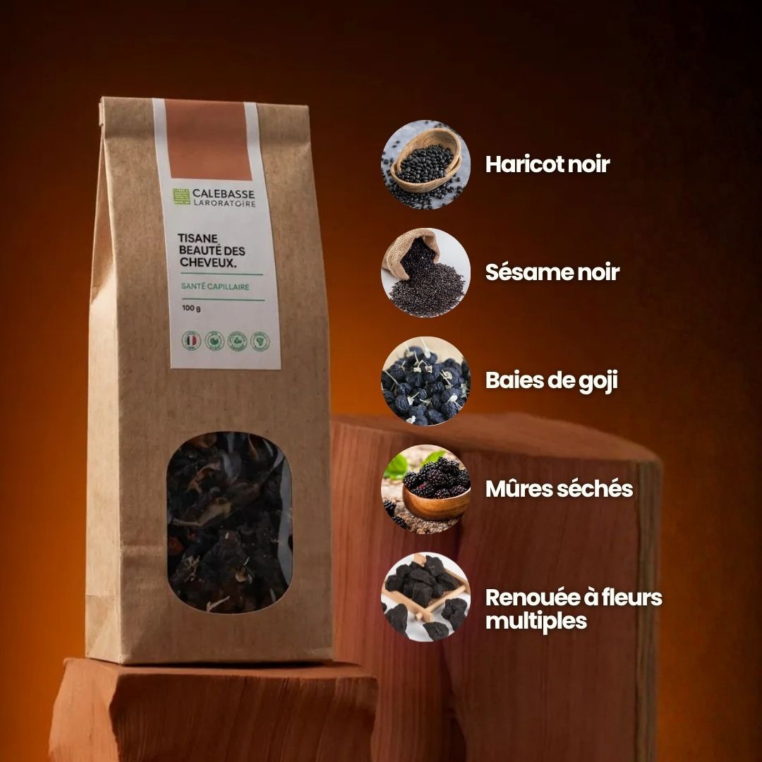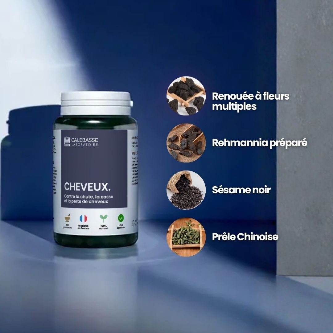 Fortifie les Reins et le Foie. Stimule les follicules en phase de repos pour une repousse active et prévient les cheveux blancs précoces.