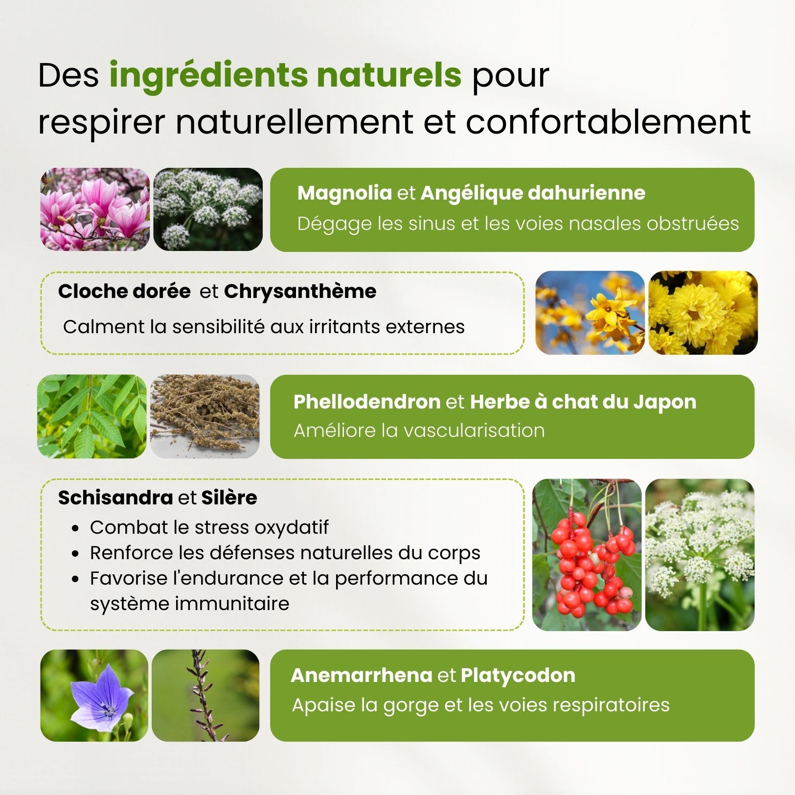 - Angélique dahurienne : Aide à libérer les voies respiratoires des obstructions en facilitant l'élimination des sécrétions, pour une respiration plus claire.