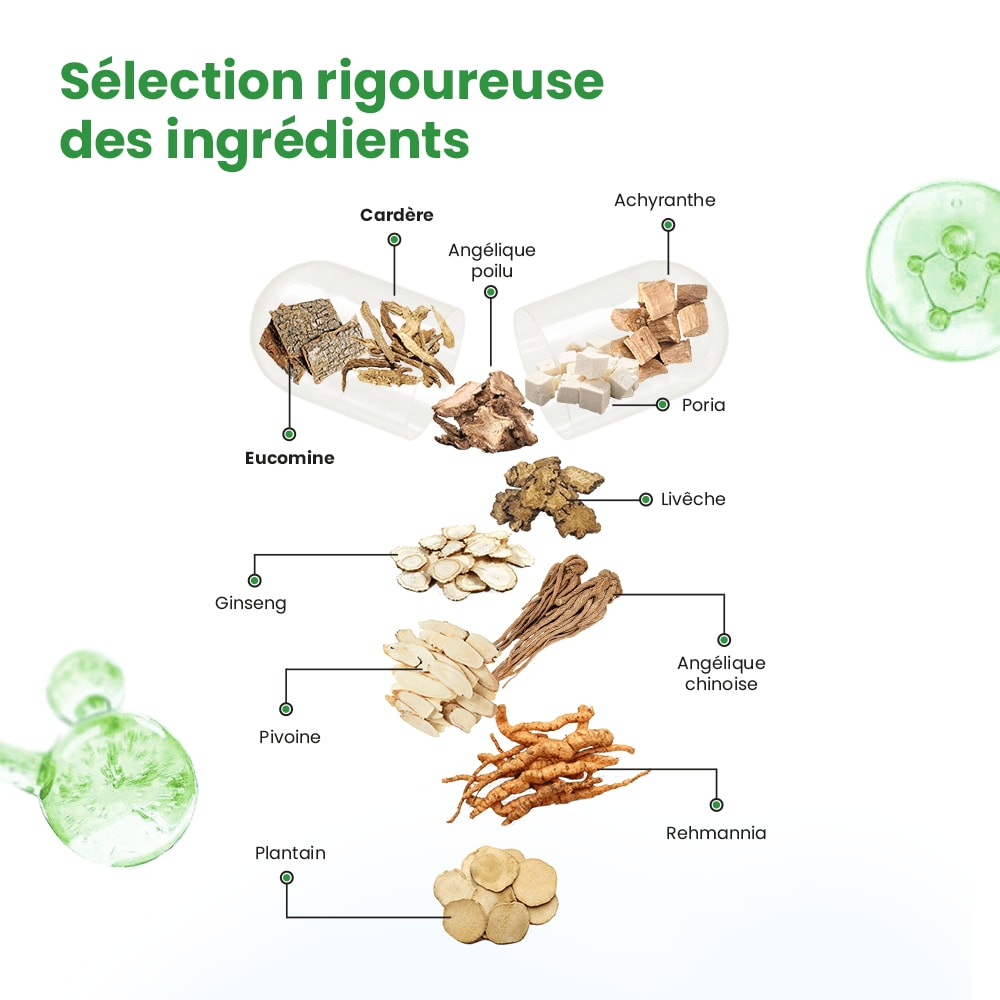 Notre formule favorise activement la régénération et le renforcement du cartilage. L'Eucomine et la Rehmannia sont spécialement choisies pour leur capacité à soutenir le renouvellement des tissus cartilagineux et à favoriser la circulation de l'énergie. L'Angélique poilu et l’Achyranthe jouent un rôle crucial dans le maintien de la souplesse des articulations et le renforcement des os, contribuant à la solidité et à l'intégrité du cartilage.