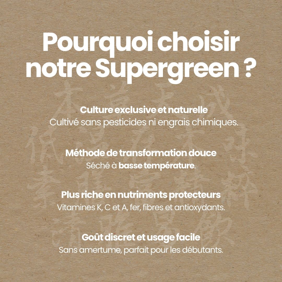 En seulement 10 g de poudre, vous profitez d’un véritable concentré de vitamines, minéraux, fibres et antioxydants, souvent équivalant à une assiette entière de légumes verts frais.