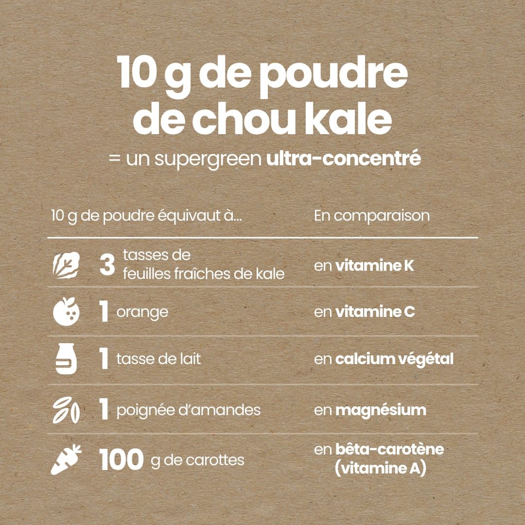 Découvrez ci-dessous ce que 10 g de chou kale en poudre peuvent vous apporter :