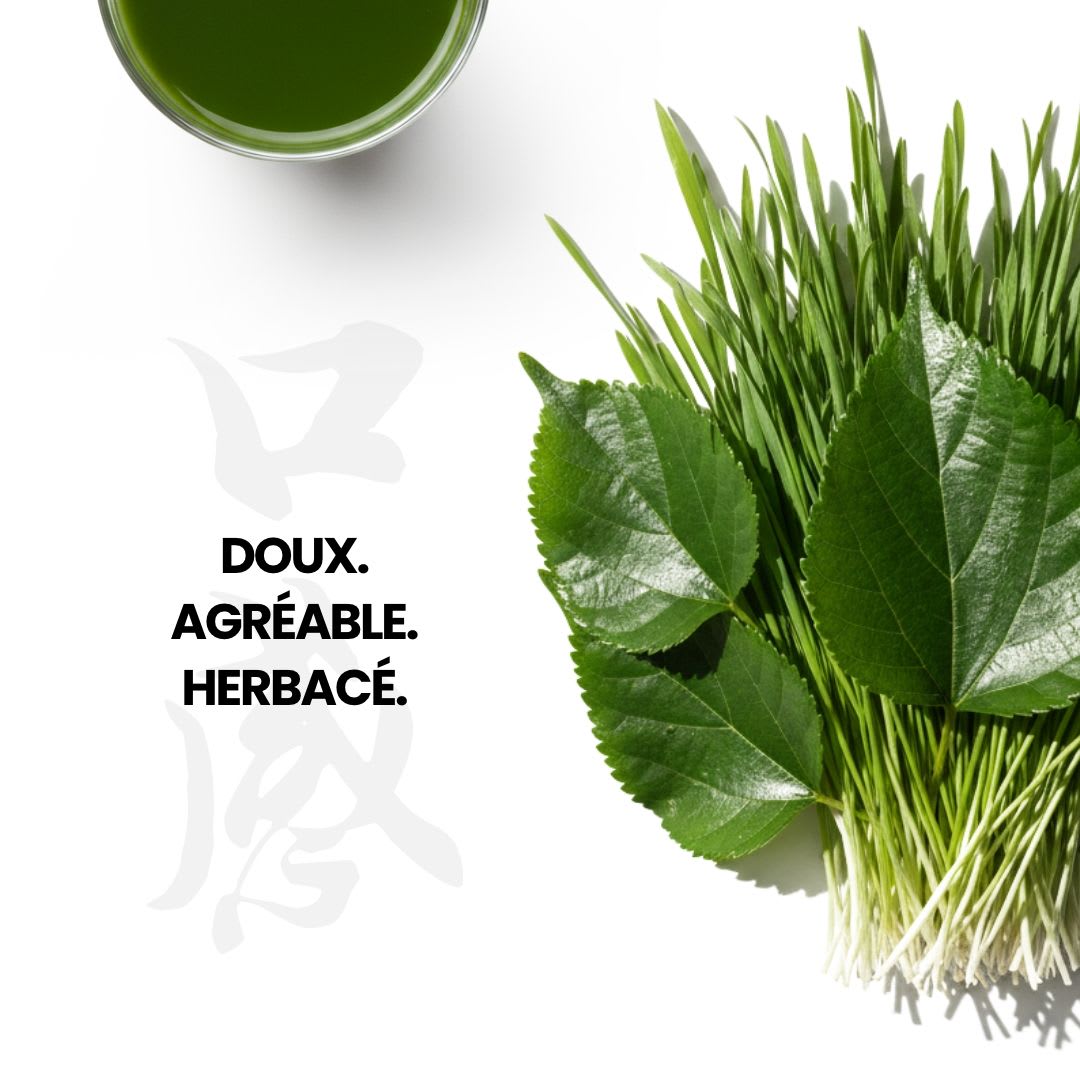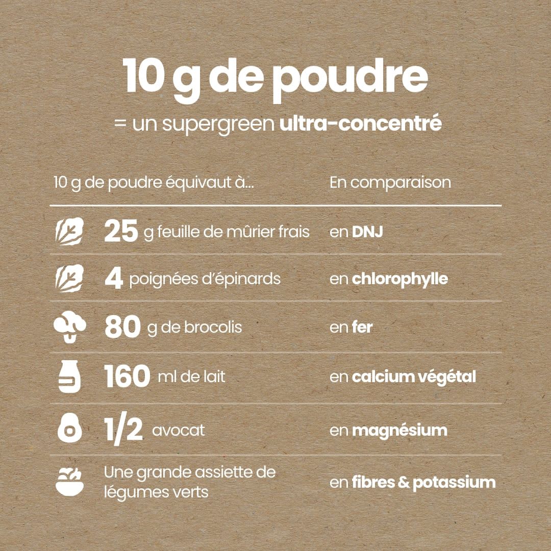 Composition pour 5 g : Poudre d’herbe d’orge 4 g, extrait de feuilles de mûrier 1 g dont DNJ≥ 1% (DNJ :1- désoxynojirimycine), sans additifs, vegan