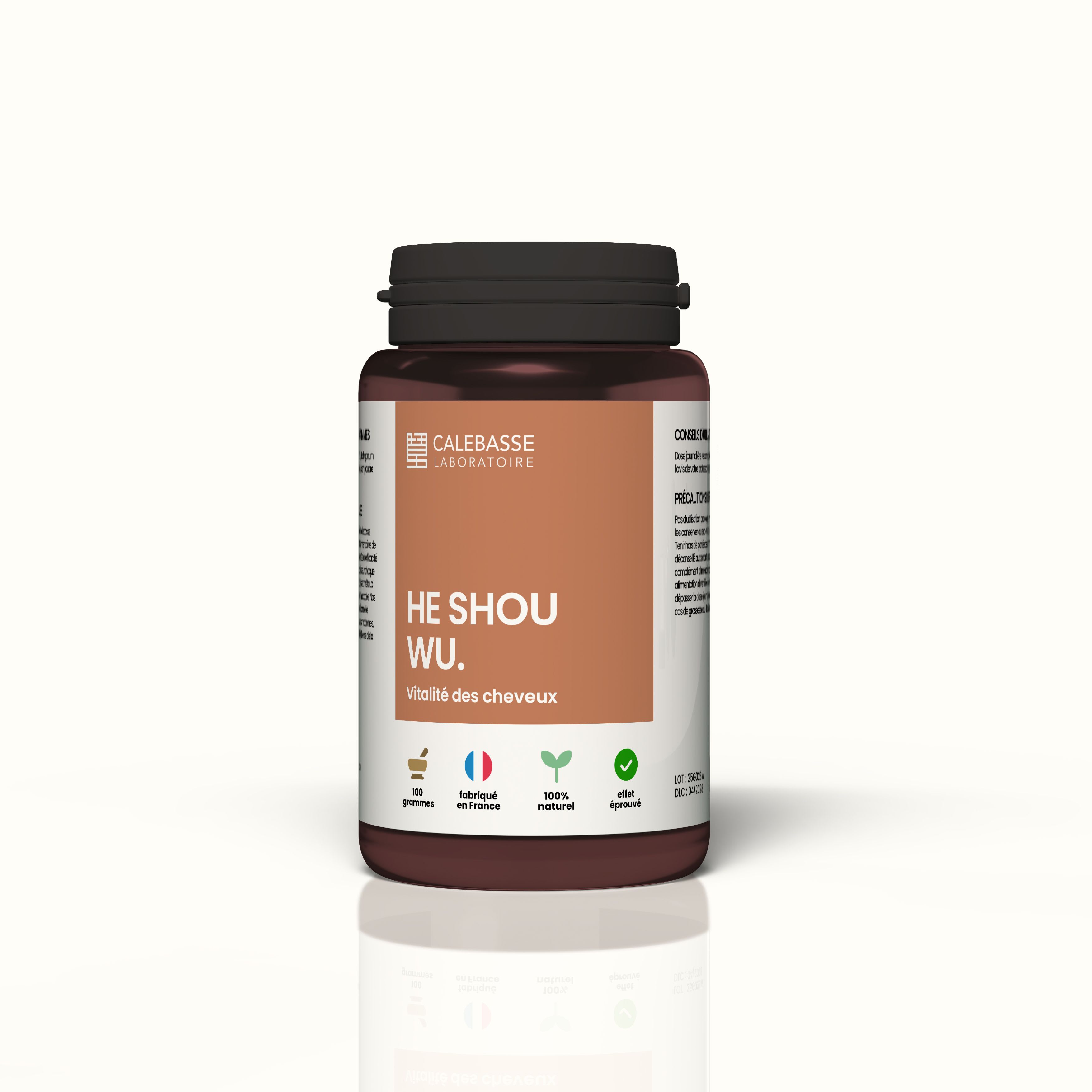 Composition pour 6 gélules (3 g) : Fallopia multiflora 3000 mg, Extrait sec aqueux en poudre concentrée, titré à 1:5, gélules végétales en pullulan