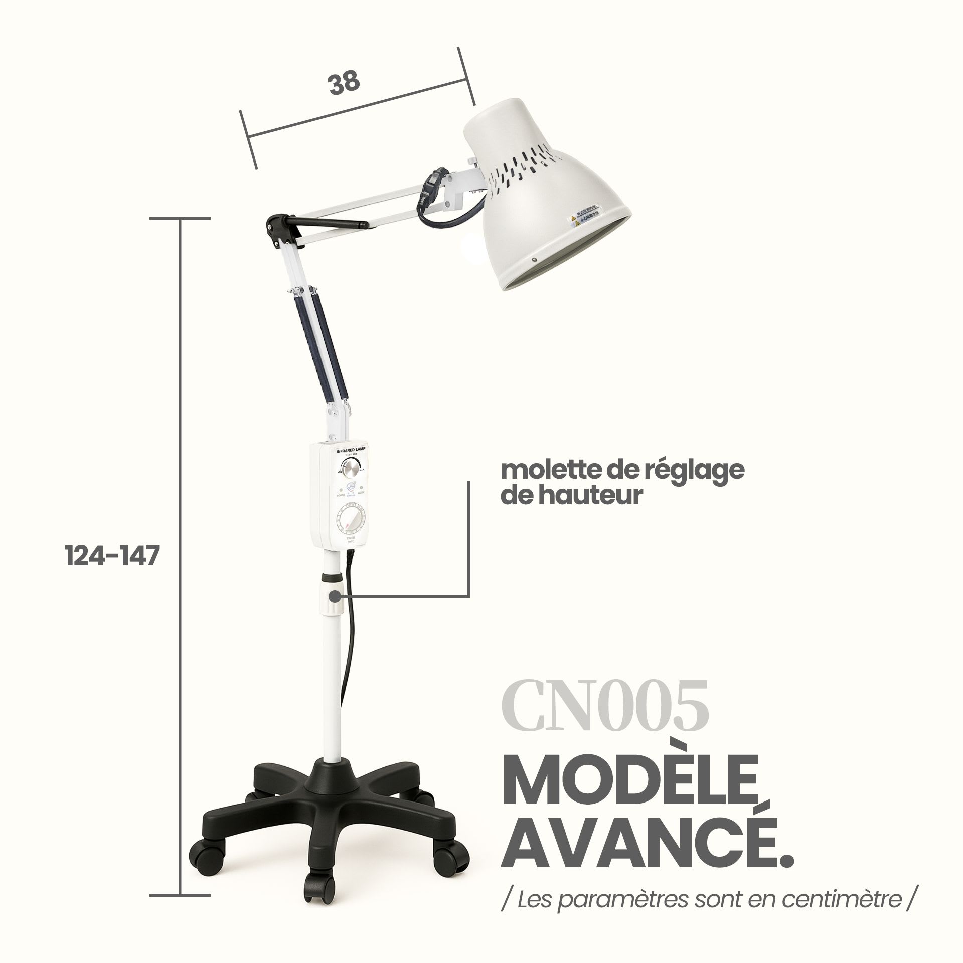 | Hauteur totale | 124–147 cm (réglable) + 38 cm (incl. lampe) |