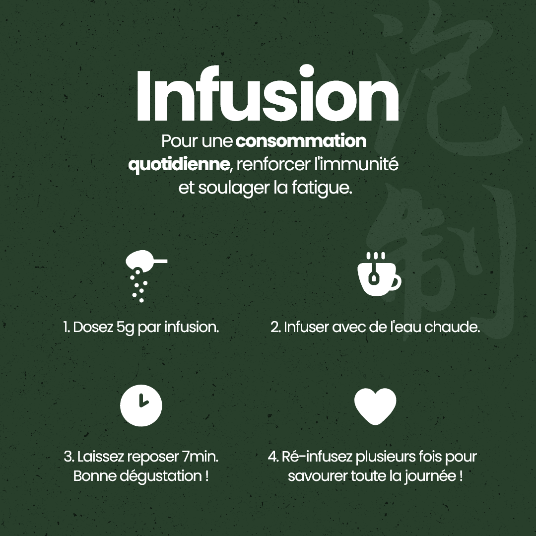 - Ré-infusez jusqu’à 3 fois et dégustez cette infusion chaude tout au long de la journée. Son goût naturellement doux et rafraîchissant en fait une excellente alternative aux boissons classiques.