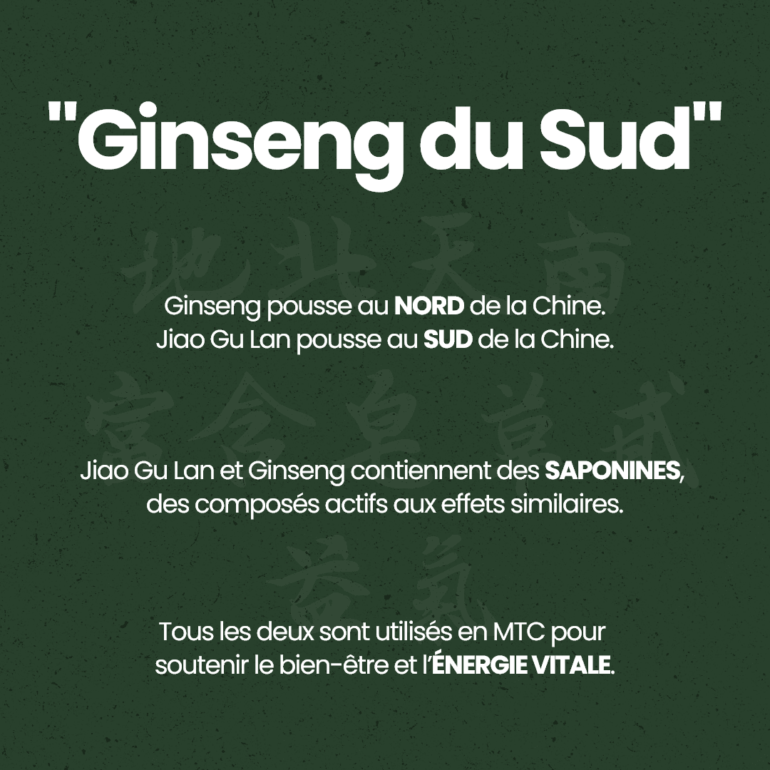 Surnommée "Ginseng du Sud", elle est souvent comparée au ginseng en raison de sa richesse en saponines, des composés actifs similaires à ceux présents dans le ginseng, qui influencent ses bienfaits sur l’équilibre général du corps. Alors que le ginseng pousse dans les régions froides et montagneuses du nord de la Chine, Jiao gu lan prospère dans les climats plus chauds et humides du sud. Cette distinction géographique lui vaut son surnom, bien que ces deux plantes appartiennent à des familles botaniques différentes.