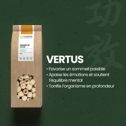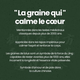 ✓ Un soutien pendant les périodes de fatigue : En renforçant les Reins et la Rate, Lian zi aide à stabiliser l’énergie et soutenir la vitalité.