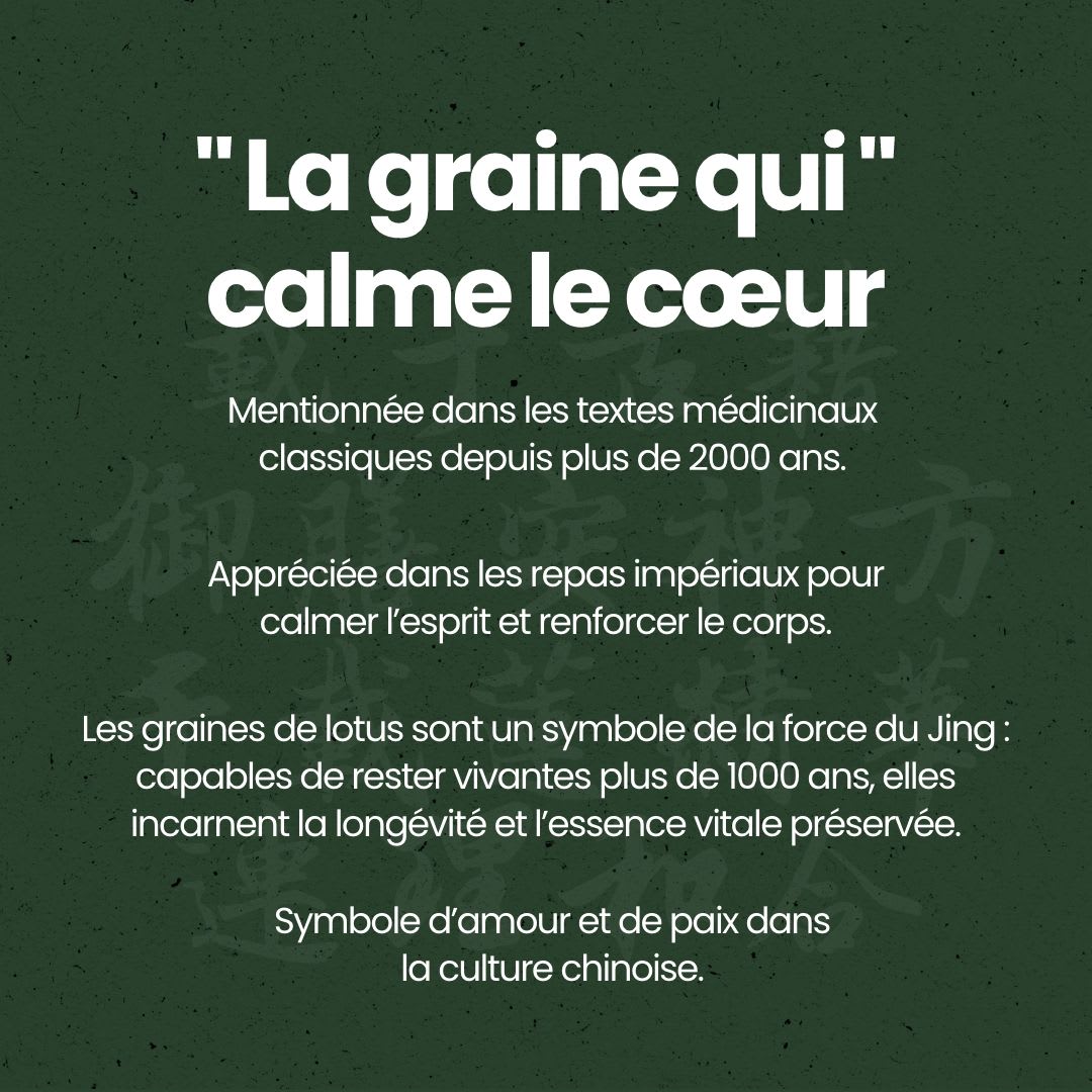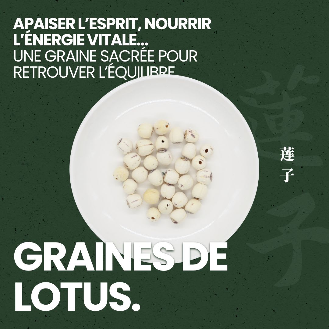 Les graines de lotus, ou Lian zi (莲子) en médecine traditionnelle chinoise (MTC), sont extraites du fruit du lotus sacré, symbole de pureté, d’harmonie et d’éveil spirituel en Asie. Derrière leur apparence sobre se cache une puissance insoupçonnée : un allié naturel pour retrouver le calme intérieur et soutenir l’énergie du corps.