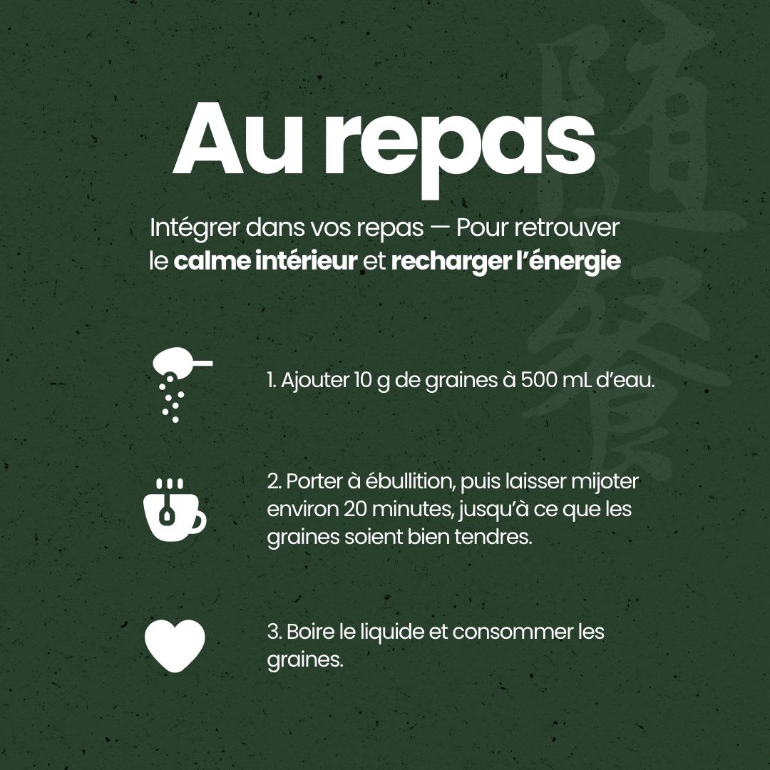 Ajouter 10 g de graines à 500 mL d’eau froide. Porter à ébullition, puis laisser mijoter à feu doux pendant 10 minutes. Boire l’infusion et consommer les graines pour profiter de l’ensemble des bienfaits.