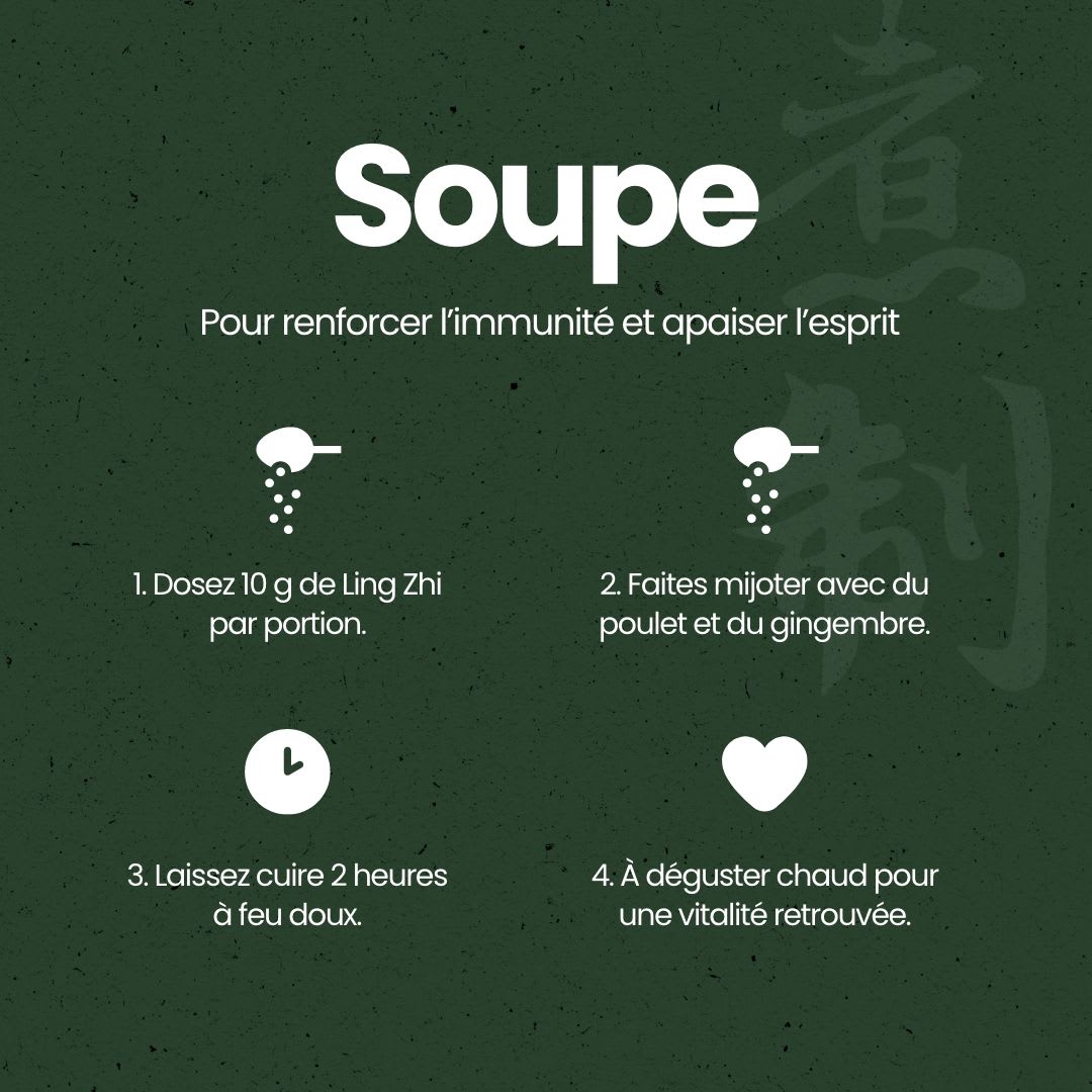 Intégrer le Reishi à une soupe ou un bouillon nutritif enrichit le repas en bienfaits protecteurs. Il contribue à stimuler les défenses naturelles, limite la fatigue et protège les cellules grâce à ses propriétés antioxydantes, pour accompagner le corps de manière globale et durable.