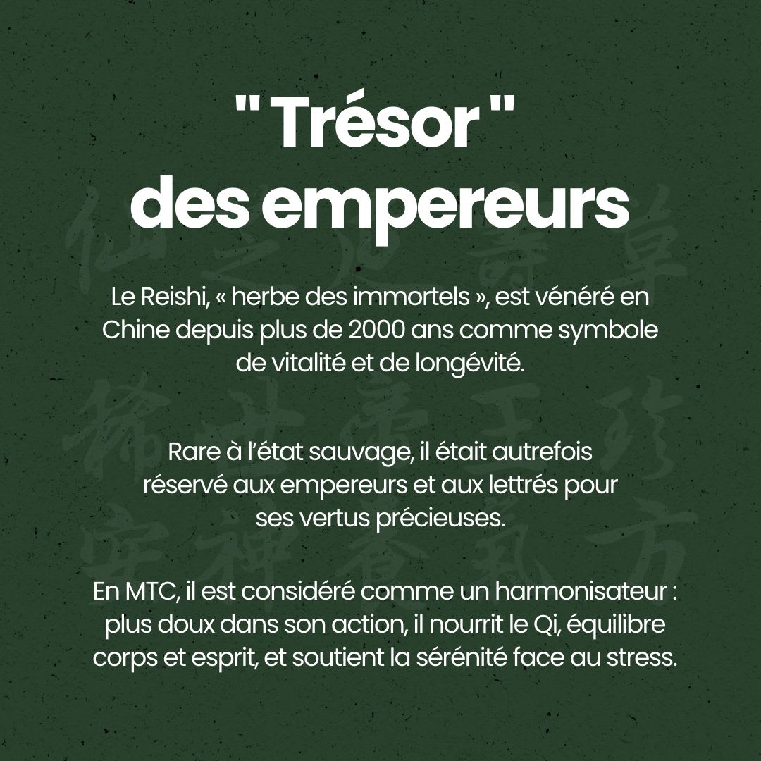 Trésor de la pharmacopée traditionnelle chinoise, le reishi est vénéré depuis plus de deux millénaires. Dans les anciens écrits, on le retrouve sous le nom poétique « herbe des immortels », symbole de vitalité et de longévité. Rare et précieux à l’état sauvage, il fut longtemps réservé aux empereurs et aux lettrés.