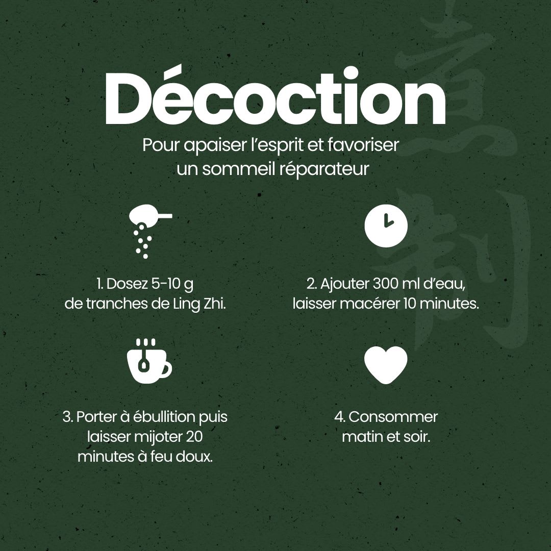 Lors des journées stressantes ou des nuits agitées, une décoction de Reishi offre détente et équilibre. Elle participe à calmer le mental, favorise un sommeil profond et soutient l’organisme dans sa récupération naturelle.