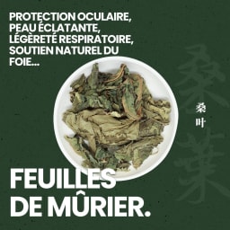 Surnommée “Feuille des Immortels”, la feuille de mûrier (桑叶, Sang Ye) est récoltée au moment où la sève atteint son apogée. En médecine traditionnelle chinoise, elle est reconnue pour clarifier la chaleur, apaiser les poumons et équilibrer l’énergie du foie, notamment en cas d’irritabilité, de yeux secs ou d’éruptions cutanées.