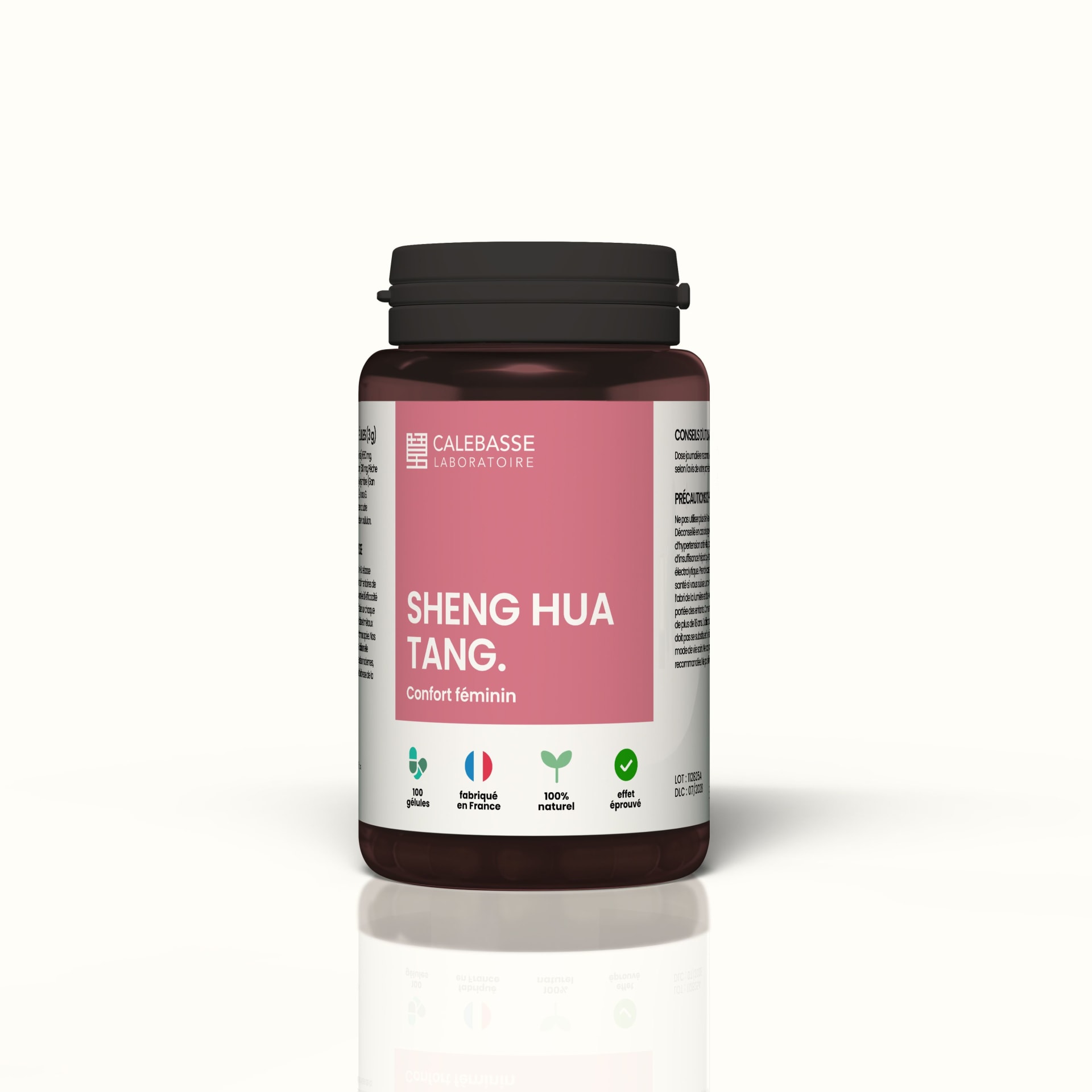 Composition pour 6 gélules (3 g) : Angelica sinensis 1650 mg, Ligusticum striatum 630 mg, Prunus persica 420 mg, Zingiber officinale 150 mg, Glycyrrhiza uralensis 150 mg, Extrait sec aqueux en poudre concentrée, titré à 1:5, gélules végétales en pullulan